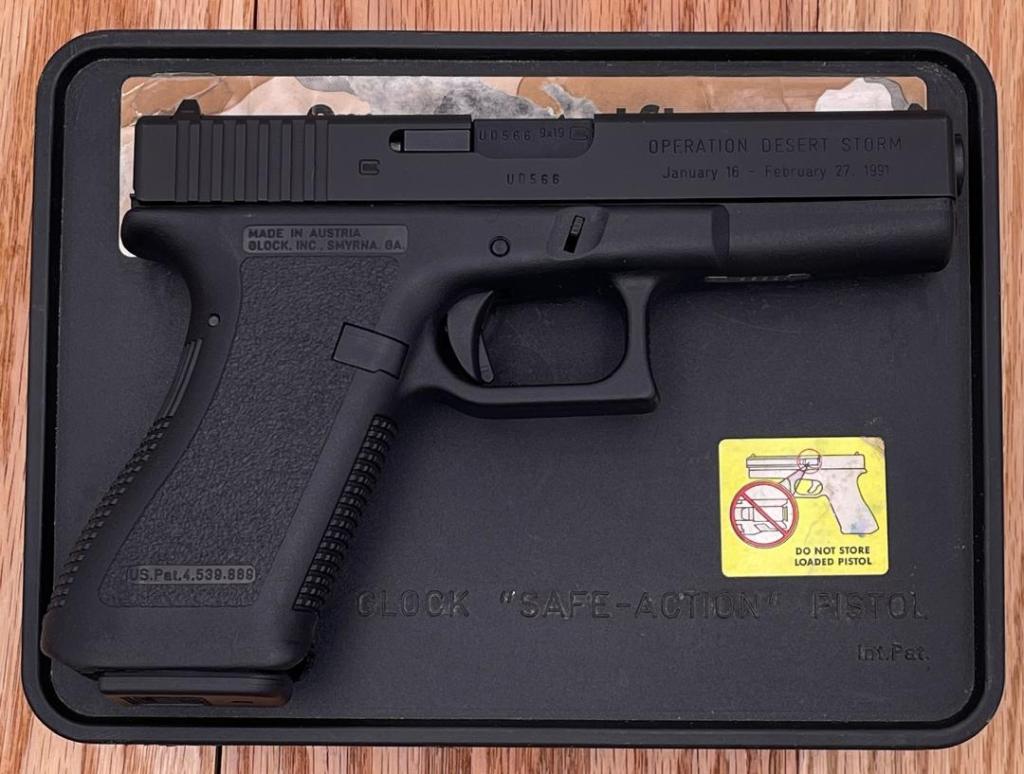 This special edition Glock was released in the spring of 1991 to commemorate the decisive coalition force triumph in the short lived Desert Storm war. Production was limited to 1,000 units (the entire UD prefix serial bank) and the model 17s were engraved on all three sides of the slide. There are various reports of the number, finish, and full contents of the earliest units but it is known that the first 50 also came with a knife and mahogany display case.