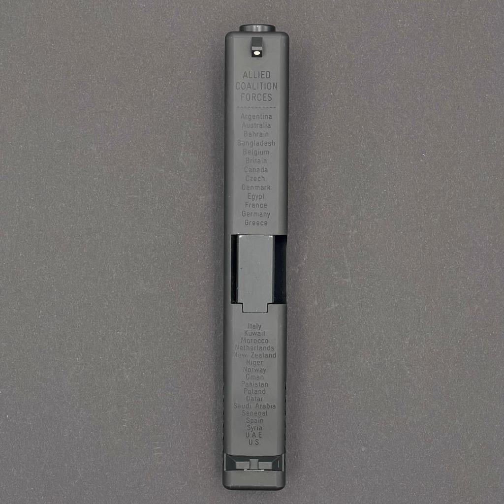 Along the top of the slide, Glock engraved the names of all 30 coalition countries involved in Desert Storm and you will find nearly every version of color filling on these (the large amount of text just begs to be filled in) but the original is all black as seen here. Even the list of countries involved can be an interesting study; what the heck was Niger doing helping to invade Iraq!?
